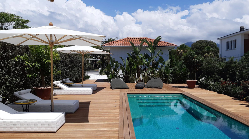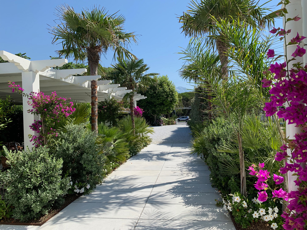 Una spiaggia privata ad uso esclusivo degli ospiti della struttura alberghiera di super lusso pensata e voluta da Oleg Tinkov per Forte dei Marmi. Grandi tende, una passerella in marmo bianco di Carrara ed una scenografia verde realizzata da esemplari unici per tipo e specie, arbusti da fiore e collezioni di Hydrangea.