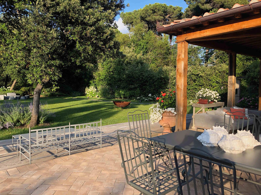 Il Giardino è stato completamente ripensato da Alessandro De Francesco che in accordo con la proprietà e in brevissimo tempo ha realizzato una scenografia verde in armonia con il parco circostante.La sfida era di realizzare dove prima c’erano chiome di alberi e sottobosco, un nuovo giardino dall’aria naturale e quasi spontanea, La scelta di piante prevalentemente della macchia mediterranea come Quercus ilex, Laurus nobilis, Arbutus unedo, Pistacia lentisco è andata in questa direzione.